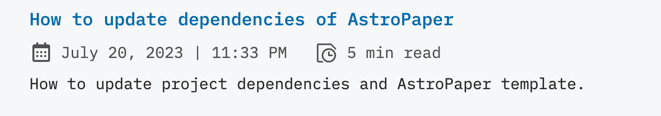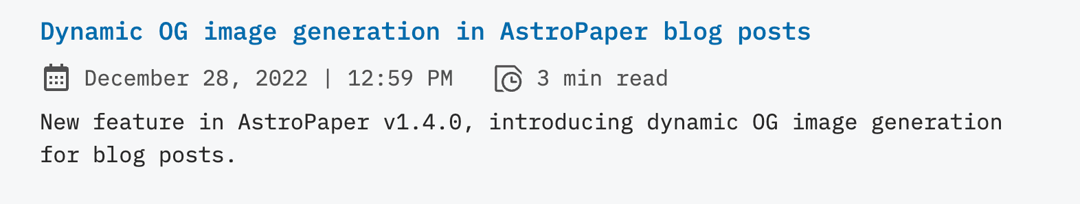 export default function Card({ href, frontmatter, secHeading = true }: Props) { const { title, pubDatetime, description, readingTime } = frontmatter; return ( <li className="my-6"> // ... <div className="flex items-center"> <Datetime datetime={pubDatetime} size="lg" className="my-2" /> <Readtime size="lg" time={readingTime} /> </div> // ... </li> );}看一下效果